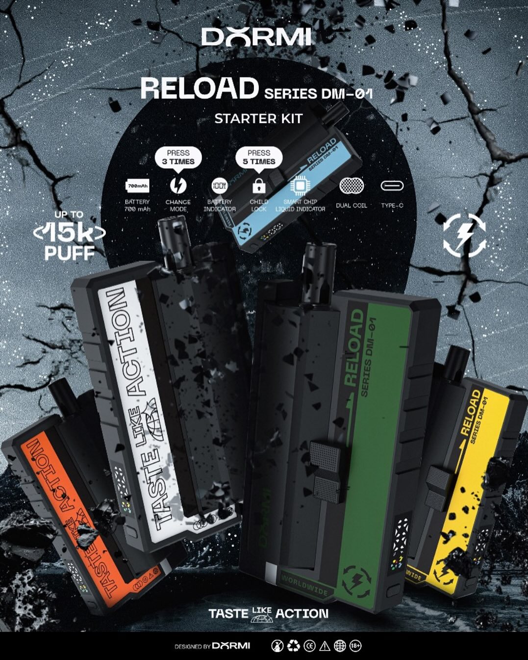 | Colour / Flavour | RELOAD BLUE STARTER KIT 15000 – ROOTBEER, RELOAD BLUE STARTER KIT 15000 – SEA SALT LEMON, RELOAD BLUE STARTER KIT 15000 – SOUR MANGO BUBBLEGUM, RELOAD GREEN STARTER KIT 15000 – GUAVA HONEYDEW, RELOAD GREEN STARTER KIT 15000 – SOUR TROPICANA, RELOAD GREEN STARTER KIT 15000 – TARO CHEESE, RELOAD ORANGE STARTER KIT 15000 – LEMON SPRITE, RELOAD ORANGE STARTER KIT 15000 – VANILLA COLA, RELOAD ORANGE STARTER KIT 15000 – WATERMELON DEW, RELOAD WHITE STARTER KIT 15000 – LYCHEE PEACH, RELOAD WHITE STARTER KIT 15000 – STRAWBERRY GRAPE, RELOAD WHITE STARTER KIT 15000 – STRAWBERRY ICE CREAM, RELOAD YELLOW STARTER KIT 15000 – APPLE LYCHEE, RELOAD YELLOW STARTER KIT 15000 – LEMON MENTHOL, RELOAD YELLOW STARTER KIT 15000 – STRAWBERRY CHEESECAKE |