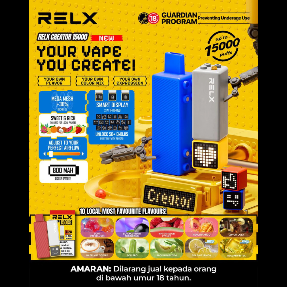 The RELX Creator Kit offers an impressive up to 15,000 puffs. This vape features an 800mAh battery for long-lasting use and all range adjustable airflow. With a variety of rich & sweet flavors available, and equipped with pixel screen displaying over 50 emojis, this vape caters to different preferences.